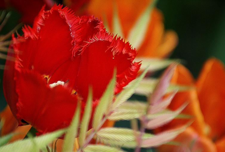 Keywords: tulips flowers red orange the blossoming of flowering chalices of flowers jagged tulip spring nature flora closeup garden flowers the background thuja the stems composition