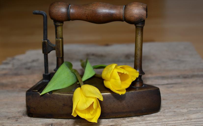 Keywords: tulips flowers yellow yellow flowers iron old iron antique wood