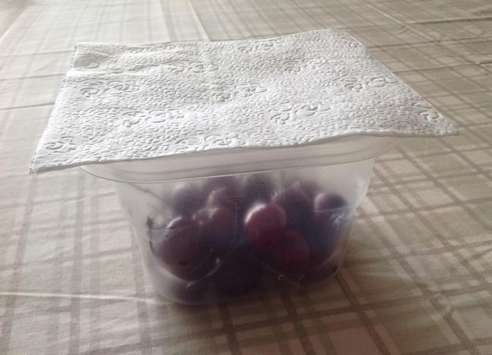 Tupperware container of cherries with a makeshift napkin lid.jpg (693x500)