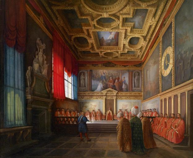 Keywords: Türkische Gesandte in Venedig.jpg Empfang der osmanischen Gesandtschaft beim Dogen von Venedig in der Sala del Collegio des Dogenpalastes oil on canvas 68 5 x 83 cm http //www dorotheum com Dorotheum otherdate b 1797 langswitch end of Venetian republic Ende der Republik Venedig attributed to PD-old-100 Images from Dorotheum Giuseppe Bernardino Bison Interior of the Doge's Palace Venice - Sala del Collegio Paintings of the Doge's Palace Venice Diplomats in art |