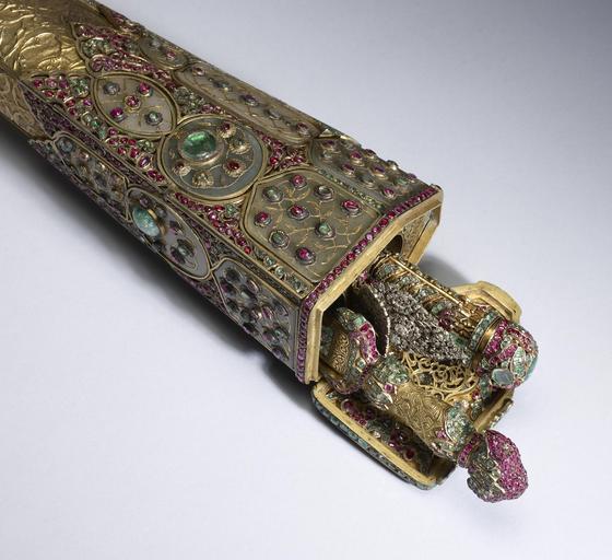 | Keywords: Turkish - Rifle - Walters 5184 - Detail A.jpg Referencing the elite pastimes of hunting and writing this ceremonial jeweled rifle set includes a dagger pen case penholder with pen penknife cleaner and a spoon-all conveniently housed within the rifle butt Penknives were important elements in the calligrapher's toolset and their handles were often elaborately decorated The hardness of the reed used for pens throughout Islamic lands required a good blade to make a clean cut The small spoon was used to put black powder into the flash pan in preparation for firing the rifle The imperial monogram tughra of the Ottoman ruler Sultan Mahmud I r 1730-54 is inscribed in diamonds inside the hinged panel of the rifle butt The artist Muhammad and the rifle's owner Ahmad Khan who had possession of the rifle at some point are also named 1732-33 Early Modern rifle steel wood gold gilded silver gilded brass silver nephrite diamonds emeralds rubies or spinels ; dagger steel inlaid with gold rubies and beryls cm 24 8 139 7 7 accession number 51 84 22655 R S Pardo Constantinople date and mode of acquisition unknown Henry Walters Baltimore 1903 mode of acquisition unknown Walters Art Museum Henry Walters Acquired by Henry Walters 1903 Translation on barrel What God wills on flintlock Work of Muhammad; its owner is Ahmad Khan tughra hidden under panel in stock is that of Sultan Mahmud I r 1730-1754 place of origin Turkey Walters Art Museum license Islamic metalwork in the Walters Art Museum Weapons in the Walters Art Museum Firearms of the Ottoman Empire Art from Turkey Media contributed by the Walters Art Museum needs category review |