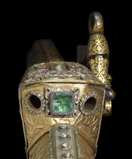 | Keywords: Turkish - Rifle - Walters 5184 - Detail K.jpg Referencing the elite pastimes of hunting and writing this ceremonial jeweled rifle set includes a dagger pen case penholder with pen penknife cleaner and a spoon-all conveniently housed within the rifle butt Penknives were important elements in the calligrapher's toolset and their handles were often elaborately decorated The hardness of the reed used for pens throughout Islamic lands required a good blade to make a clean cut The small spoon was used to put black powder into the flash pan in preparation for firing the rifle The imperial monogram tughra of the Ottoman ruler Sultan Mahmud I r 1730-54 is inscribed in diamonds inside the hinged panel of the rifle butt The artist Muhammad and the rifle's owner Ahmad Khan who had possession of the rifle at some point are also named 1732-33 Early Modern rifle steel wood gold gilded silver gilded brass silver nephrite diamonds emeralds rubies or spinels ; dagger steel inlaid with gold rubies and beryls cm 24 8 139 7 7 accession number 51 84 22655 R S Pardo Constantinople date and mode of acquisition unknown Henry Walters Baltimore 1903 mode of acquisition unknown Walters Art Museum Henry Walters Acquired by Henry Walters 1903 Translation on barrel What God wills on flintlock Work of Muhammad; its owner is Ahmad Khan tughra hidden under panel in stock is that of Sultan Mahmud I r 1730-1754 place of origin Turkey Walters Art Museum license Islamic metalwork in the Walters Art Museum Weapons in the Walters Art Museum Firearms of the Ottoman Empire Art from Turkey Media contributed by the Walters Art Museum needs category review |