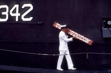 Keywords: Turkish sailor removing the nameplate of Gudgeon.jpg en A Turkish sailor removes the name from the Tang class submarine ex-Gudgeon SSAG-567 during the transfer ceremony at Point Loma California on 30 Sep 1983 1963-09-30 http //navsource org/archives/08/500/0856718 jpg Image in http //www navsource org/archives/08/08567 htm navsource org USN photo DN-ST-85-08684 by PH1 Bob Weissleder from the Department of Defense Still Media Collection courtesy of dodmedia osd mil submitted by Bill Gonyo PD-USN Uploaded with UploadWizard TCG Hızırreis S-342 |
