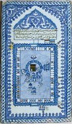 | Keywords: Turkish - Tile with the Great Mosque of Mecca - Walters 481307 - View A.jpg The three lines of Arabic writing in the upper part of this large ceramic wall tile are from the third chapter of the Qur'an and exhort the Muslim faithful to make the pilgrimmage to Mecca The rest of the tile is given over to a bird's-eye representation of the Great Mosque in Mecca with the Ka'ba Islam's holiest shrine in the center surrounded by various other structures all identified in Arabic and a rectangular portico around the courtyard Such tiles may have been created to remind Muslims of their obligation to make the pilgrimage and to introduce potential hajji or pilgrims to the places and practices they would encounter in Mecca The plaques also may have been intended for commemoration and contemplation following a hajji's experience at the Ka'ba century 17 Ottoman fritware with underglaze painting cm 62 4 35 8 3 5 accession number 48 1307 17197 Henry Walters Baltimore 1897 mode of acquisition unknown Walters Art Museum Henry Walters Acquired by Henry Walters 1897 Translation From Qur'an 3 96-97 The first House established for the people was that at Bekka Mecca a place holy and a guidance to all beings Therein are clear signs- the station of Abraham and whosoever enters it is in security It is the duty of all men towards God to come to the House a pilgrim if he is able to make his way there The Divine Word and Sacred Sites of Islam The Walters Art Gallery Baltimore 1997 Highlights from the Collection The Walters Art Gallery Baltimore 1998-2001 Maps Finding Our Place in the World The Field Museum Chicago; The Walters Art Museum Baltimore 2007-2008 place of origin Iznik in present-day Turkey Walters Art Museum license 2D Islamic art in the Walters Art Museum Art from Turkey Media contributed by the Walters Art Museum needs category review Hajj 1700s İznik ceramics |