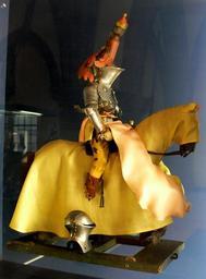 Keywords: Turnierritter Spielzeug c 1540 (copy).jpg Turnierritter im Stechzeug mit Helm-Kleinod und Wechsel-Helm Kopie Fahrgestell Original Nürnberg um 1540/1550 Modell-Spielzeug ehemals im Besitz der Nürnberger Familie Holzschuher Tournament knight Copy of a 1540/1550 toy from Nuremberg the undercarriage is an original Model toy formerly in posession of the Holzschuher family Nuremberg <br /><br />Bayerisches Nationalmuseum München; Inv Nr W 940/942 own 2007-02 Photo Andreas Praefcke Public Domain Arms in the Bayerisches Nationalmuseum Medieval knights on horseback Tournaments Toys Holzschuher von Harrlach family Caparison |