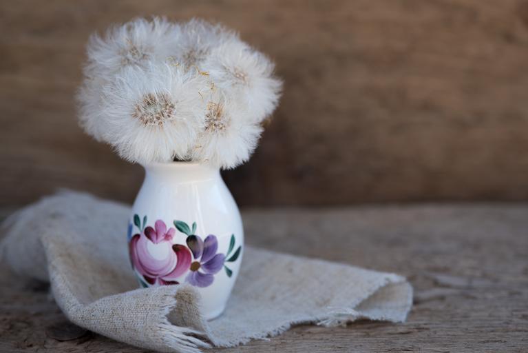 Keywords: tussilago farfara dandelion seeds white close vase country life deco decoration