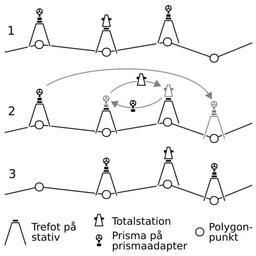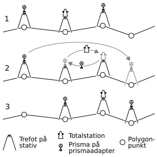 Keywords: Tvångscentrering.svg Tvångscentrering är ett sätt att mäta polygontåg Genom att bara byta plats på totalstationen och prismorna och genom att ha trefoten fastskruvad på stativet så kan man veta att alla mätnigar är gjorda till och från samma punkter Det ger ett bättre resultat vid de efterföljande beräkningarna och om det finns några felaktiga mätningar blir de lättare att upptäcka traverses By only swapping the total station and the prisms and by having the tribrachs fixed to the tripods you will know that you have taken all the readings to and from the same points This will give a better result in the following calulations and if there is some flaved readings they will more easely be found Own Johan Gustafsson 2009-09-11 KJG2007 <gallery> File Leapfrogging svg en Leapfrogging svg </gallery> Survey method diagrams |