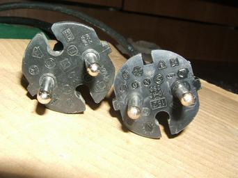 Keywords: Two CEE 7 17 plugs.JPG en Two slightly different CEE 7/17 plugs The left one can be inserted in both positions into an E-type socket The right one fits only in one direction pl Dwie nieznacznie różniące się między sobą wtyczki CEE 7/17 Lewa może być włożona do gniazdka typu E jak stosowane w Polsce w dwóch położeniach prawa pasuje tylko w jednym de Zwei Varianten des Konturensteckers CEE 7/17 Der linke Stecker kann in eine E-Steckdose Standard in Frankreich Polen Tschechien Slovakei Belgien in beiden Richtungen eingesteckt werden die Rechte dagegen passt nur in eine Richtung 2012-01-21 own Draco flavus cc-zero Uploaded with UploadWizard CEE 7/17 |