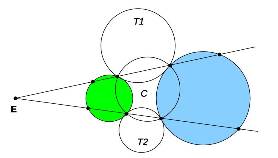 Keywords: Two circles tangent radical.svg en If E is the homothetic center of two given circles then E belongs to the radical axis of any two circles which are tangent to the given own Cleric K Circles with tangent