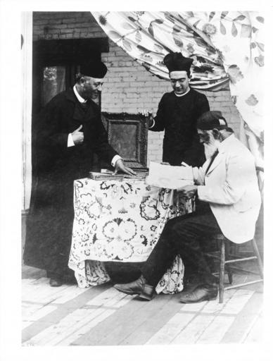 Photograph of two Los Angeles Plaza church priests (Father Relbana and Father Cote) with Don Antonio Coronel examining church records, ca.1885-1900. Coronel, sitting, reads a document in his hands. One of the priests leans on the table with his right hand and has his left hand placed inside his lapel. The two priests, dressed in cassocks, stand beside the table at which Coronel sits. A flowery tablecloth covers the table on which various documents lay. Behind them a curtain is pulled back revealing a brick wall and window.