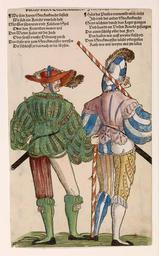 | Keywords: Two Military Policemen.jpg ru Двое военных полицейских en When lansquenets misbehaved they could expect to have their collars felt by 'Steckenknechten' the equivalent of military policemen They made the actual arrests on the provost's orders if there was a breach of the peace These men received double pay but the lansquenets regarded their post as dishonourable 1530 Like Steffan Goldschmidt this weaver from Ulm gave up his trade to become a lansquenet He was lucky to have been chosen as a 'Waibel' by the lansquenets; this was a well-paid post that attracted three times the usual rate of pay A 'Waibel' assisted the corporal of the field in drawing up and practising the order of march and battle He was also an important intermediary between the lansquenets and their captain Creator Niklas Stör other versions Custom license marker 2015 12 07 PD-art-100 16th-century woodcuts of people Landsknechts Prints in the Museum Boijmans Van Beuningen Niklas Stör Uploaded with UploadWizard Pluderhose 16th-century fashion Fashion of Germany Berets in art Feathered headdresses in art male Military uniforms in the 16th century |