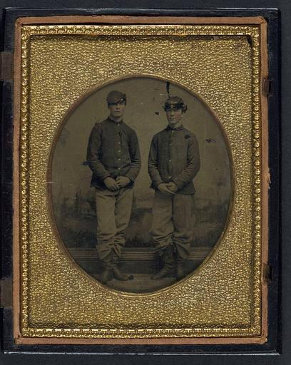 | Keywords: library of congress libraryofcongress dc:identifier=http://hdl.loc.gov/loc.pnp/ppmsca.27205 dc:identifier=httphdllocgovlocpnpppmsca27205 xmlns:dc=http://purl.org/dc/elements/1.1/ xmlns:dc=httppurlorgdcelements11 civil war civilwar us civil war uscivilwar united states unitedstates soldier american american civil war americancivilwar uniform military plantation soldiers photo border round [Two unidentified young soldiers in Union shell jackets and forage caps in front of painted backdrop showing plantation] [between 1861 and 1865] 1 photograph : quarter-plate tintype, hand-colored ; 12.3 x 9.9 cm (case) Notes: Title devised by Library staff. Case: Berg, no. 1-193. Gift; Tom Liljenquist; 2010; (DLC/PP-2010:105). Subjects: United States.--Army--People--1860-1870. Soldiers--Union--1860-1870. Youth--1860-1870. Backdrops--1860-1870. Military uniforms--Union--1860-1870. United States--History--Civil War, 1861-1865--Military personnel--Union. Format: Group portraits--1860-1870. Portrait photographs--1860-1870. Tintypes--Hand-colored--1860-1870. Rights Info: No known restrictions on publication. Repository: Library of Congress, Prints and Photographs Division, Washington, D.C. 20540 USA, hdl.loc.gov/loc.pnp/pp.print Part Of: Ambrotype/Tintype filing series (Library of Congress) (DLC) 2010650518 Liljenquist Family collection (Library of Congress) (DLC) 2010650519 More information about this collection is available at hdl.loc.gov/loc.pnp/pp.lilj Persistent URL: hdl.loc.gov/loc.pnp/ppmsca.27205 Call Number: AMB/TIN no. 2352 [Two unidentified young soldiers in Union shell jackets and forage caps in front of painted backdrop showing plantation] [between 1861 and 1865] 1 photograph : quarter-plate tintype, hand-colored ; 12.3 x 9.9 cm (case) Notes: Title devised by Library staff. Case: Berg, no. 1-193. Gift; Tom Liljenquist; 2010; (DLC/PP-2010:105). Subjects: United States.--Army--People--1860-1870. Soldiers--Union--1860-1870. Youth--1860-1870. Backdrops--1860-1870. Military uniforms--Union--1860-1870. United States--History--Civil War, 1861-1865--Military personnel--Union. Format: Group portraits--1860-1870. Portrait photographs--1860-1870. Tintypes--Hand-colored--1860-1870. Rights Info: No known restrictions on publication. Repository: Library of Congress, Prints and Photographs Division, Washington, D.C. 20540 USA, hdl.loc.gov/loc.pnp/pp.print Part Of: Ambrotype/Tintype filing series (Library of Congress) (DLC) 2010650518 Liljenquist Family collection (Library of Congress) (DLC) 2010650519 More information about this collection is available at hdl.loc.gov/loc.pnp/pp.lilj Persistent URL: hdl.loc.gov/loc.pnp/ppmsca.27205 Call Number: AMB/TIN no. 2352 |