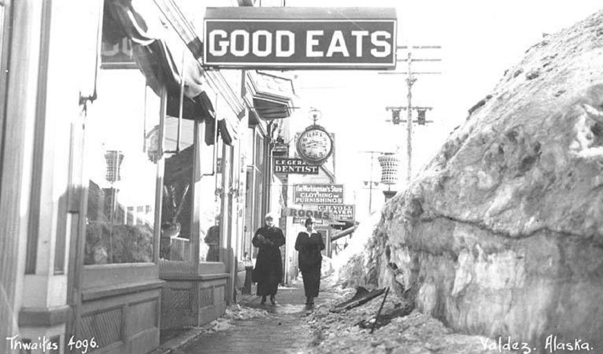 Keywords: Two women on sidewalk in Valdez, with snow piled along side, ca 1912 (THWAITES 248).jpeg check categories 27 October 2016 4 Photograph Creator John E Thwaites Caption on image Valdez Alaska PH Coll 247 530<br/>Valdez is located on the north shore of Port Valdez a deep water fjord in Prince William Sound It lies 305 road miles east of Anchorage and 364 road miles south of Fairbanks It is the southern terminus of the Trans-Alaska oil pipeline The Port of Valdez was named in 1790 by Don Salvador Fidalgo for the celebrated Spanish naval officer Antonio Valdes y Basan Due to its excellent ice-free port a town developed in 1898 as a debarkation point for men seeking a route to the Eagle Mining District and the Klondike gold fields Valdez soon became the supply center of its own gold mining region and incorporated as a City in 1901 Fort Liscum was established in 1900 and a sled and wagon road was constructed to Fort Egbert in Eagle by the U S Army The Alaska Road Commission further developed the road for automobile travel to Fairbanks; it was completed by the early 1920s Tsunamis generated by the 1964 earthquake destroyed the original City killing several residents The community was rebuilt in a more sheltered location 4 miles to the west During the 1970s construction of the Trans-Alaska oil pipeline terminal and other cargo transportation facilities brought rapid growth to Valdez In March 1989 it was the center for the massive oil-spill cleanup after the Exxon VALDEZ disaster In a few short days the population of the town tripled Subjects LCTGM Valdez Alaska ; Snow--Alaska--Valdez; Stores shops--Alaska--Valdez; Sidewalks--Alaska--Valdez; Women--Alaska--Valdez depicted place Valdez Alaska ca 1912 Institution University of Washington UWASH-THWAITES-source accession number thwaites 248 PD-old-auto-1923 1940 Information field Order Number THW272 Images from the John E Thwaites Photographs of Alaska Collection to check Valdez Alaska Snow in Alaska Sidewalks in Alaska Women |