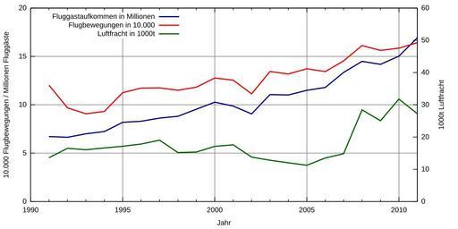 | Keywords: TXL stats.svg en Berlin Tegel Airport statistical data de Flughafen Berlin-Tegel Verkehrszahlen seit 1991 own ; data from http //www berlin-airport de/DE/UeberUns/Verkehrsstatistik/Monatlich/TXL berlin-airport de Gorgo 2011-02-13 Gnuplot script to generate this plot gnuplot <source lang gnuplot > /usr/bin/gnuplot gnuplot 4 2 / Ubuntu 8 10 input set timefmt Y set datafile separator ; output set key top left set style data lines set grid set xdata time set xlabel 'Jahr' set xrange '1990' '2012' set xtics 157680000 set mxtics 5 set format x ' Y' set ylabel '10 000 Flugbewegungen / Millionen Fluggäste' set ytics nomirror set ytics 5 set yrange 0 20 set y2tics 10 set autoscale y2 set y2range 0 60 set y2label '1000t Luftfracht' set term svg size 800 400 font Arial 10 set output 'TXL_stats svg' plot '-' using 1 2/1000000 title 'Fluggastaufkommen in Millionen' axes x1y1 lt rgb 'dark-blue' lw 2 \ '-' using 1 2/10000 title 'Flugbewegungen in 10 000' axes x1y1 lt rgb 'red' lw 2 \ '-' using 1 2/1000 title 'Luftfracht in 1000t' axes x1y2 lt rgb 'dark-green' lw 2 1991;6715402 1992;6641634 1993;7000168 1994;7234345 1995;8186512 1996;8298736 1997;8622359 1998;8810476 1999;9543437 2000;10268325 2001;9863870 2002;9055002 2003;11055303 2004;11014062 2005;11500454 2006;11787960 2007;13345188 2008;14486610 2009;14180084 2010;15025600 2011;16919820 2012;18164203 e 1991;120344 1992;96896 1993;90750 1994;93103 1995;112521 1996;117247 1997;117495 1998;115092 1999;118188 2000;127668 2001;125484 2002;111334 2003;134395 2004;131875 2005;137288 2006;134322 2007;145423 2008;161237 2009;156262 2010;158570 2011;169384 2012;171114 e 1991;13585 1992;16493 1993;16060 1994;16625 1995;17131 1996;17836 1997;19043 1998;15183 1999;15349 2000;17096 2001;17578 2002;13787 2003;12800 2004;12009 2005;11246 2006;13490 2007;14830 2008;28427 2009;25057 2010;31767 2011;26578 2012;26933 e </source> Cc-zero Statistics of Berlin Tegel Airport Images with Gnuplot source code |