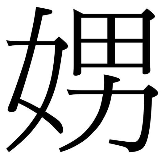 Keywords: U5A1A-female-male.svg Unicode character U5A1A 娚 an obsolescent Chinese character formerly sometimes used to write a word meaning chatter in Chinese i e 喃 or apparently a phrase meaning husband and wife in Japanese meoto i e 夫婦 Though it does not have current significant use in logographic writing systems it does somewhat symbolically contain a female/woman character U5973 女 and a male/man character U7537 男 side by side own based on font 2007 AnonMoos Songti Heterosexuality 娚 038 7 |