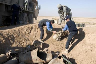 Keywords: U.S. Air Force Explosive Ordnance Disposal Detonation DVIDS139816.jpg en U S Air Force Senior Airman Nyx Zaid Nieves Lopez a videographer with Joint Combat Camera at Forward Operating Base Warrior rolls tape while a U S Air Force Explosive Ordnance Disposal team uses a radio detonation unit to explode charges set on unspent munitions that were left over from the Iran/Iraq war along with other weapons seized from insurgents by the Iraq police in Kirkuk Iraq Dec 13 2008-12-13 Petty Officer 2nd Class Brian L Short https //www dvidshub net/image/139816 081213-N-+++++-023 2008-12-31 01 51 KIRKUK IQ PD-USGov-Military-Navy Forward Operating Base Warrior Images from DoD uploaded by Fæ |