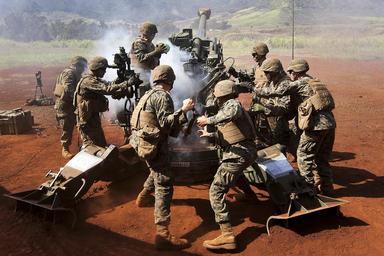 Keywords: U.S. Marines Reload M777 During Training.jpg en Marines with Bravo Battery 1st Battalion 12th Marine Regiment hastily reload an M777 howitzer with a 155 mm artillery shell during a multiple-rounds fire mission as a part of a two-day dual-fire training exercise at Schofield Barracks Hawaii Nov 13 2013 The M777s fired alongside M327 Towed-Rifled Mortar Systems to eliminate the possibility of short-range threats on the battlefield and to expand the capabilities of the battery as a whole 2013-11-14 https //www flickr com/photos/marine_corps/10944472535 Marines other versions United States Marine Corps Official Page https //flickr com/photos/40927340 N03/10944472535 2016-01-06 20 27 16 United States Government Work PD-USGov United States Marine Corps Uploaded with UploadWizard |