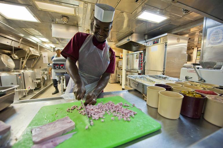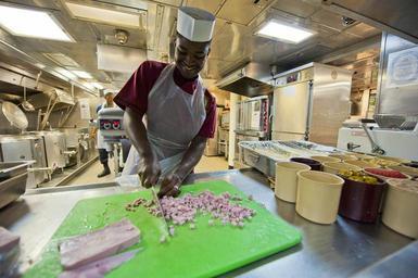 Keywords: U.S. Navy Culinary Specialist Seaman Isaiah Harris chops ham in the galley of the guided missile destroyer USS Arleigh Burke (DDG 51) March 8, 2014, in Marseille, France 140308-N-WD757-009.jpg en U S Navy Culinary Specialist Seaman Isaiah Harris chops ham in the galley of the guided missile destroyer USS Arleigh Burke DDG 51 March 8 2014 in Marseille France The Arleigh Burke was on a scheduled deployment in support of maritime security operations and theater security cooperation efforts in the U S 5th Fleet and U S 6th Fleet areas of responsibility 2014-03-08 MC2 Carlos M Vazquez II http //www defenseimagery mil/imageRetrieve action guid c5cede28fbbca06f85f9ae47e65e9551ab1c1a41 t 2 Public domain photograph from defenseimagery mil http //www defenseimagery mil/imagery html guid c5cede28fbbca06f85f9ae47e65e9551ab1c1a41 140308-N-WD757-009 2014-03-11 Marseille PD-USGov-Military-Navy USS Arleigh Burke DDG-51 Images from DoD uploaded by Fæ