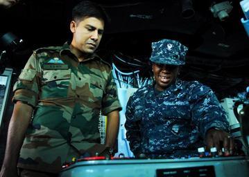 Keywords: U.S. Navy Quartermaster 3rd Class Danielle Andrews-Johnson, right, shows a radar console to Maj. Sinha Roy of the Indian Army on the bridge of amphibious assault ship USS Essex.jpg U S Navy Quartermaster 3rd Class Danielle Andrews-Johnson right shows a radar console to Maj Sinha Roy of the Indian Army on the bridge of amphibious assault ship USS Essex LHD 2 during exercise Habu Nag Sept 30 2010 in the East China Sea Habu Nag is an annual bilateral amphibious training exercise between the United States and India designed to increase interoperability on amphibious operations including humanitarian assistance and disaster response U S Navy photo by Mass Communication Specialist 3rd Class Andrew Ryan Smith/Released https //www flickr com/photos/39955793 N07/5042292418/ 100930-N-2218S-032 2010-09-30 08 39 https //www flickr com/people/39955793 N07 U S Department of Defense Current Photos PD-USGov U S Department of Defense Current Photos https //flickr com/photos/39955793 N07/5042292418 2015-12-11 18 12 49 United States Government Work East China Sea Army of India Military relations of India and the United States |