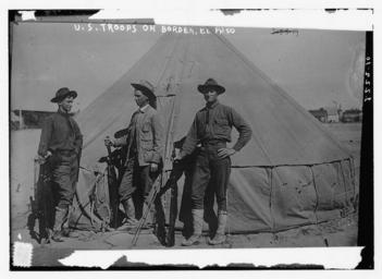 | Keywords: U.S. troops, on border, El Paso (LOC) (2163502902).jpg Bain News Service publisher U S troops on border El Paso between 1910 and 1915 1 negative glass ; 5 x 7 in or smaller Notes Title from unverified data provided by the Bain News Service on the negatives or caption cards Forms part of George Grantham Bain Collection Library of Congress Subjects El Paso Mexico Format Glass negatives Rights Info No known restrictions on publication Repository Library of Congress Prints and Photographs Division Washington D C 20540 USA http //hdl loc gov/loc pnp/pp print hdl loc gov/loc pnp/pp print General information about the Bain Collection is available at http //hdl loc gov/loc pnp/pp ggbain hdl loc gov/loc pnp/pp ggbain Persistent URL http //hdl loc gov/loc pnp/ggbain 09388 hdl loc gov/loc pnp/ggbain 09388 Call Number LC-B2- 2222-10 http //www flickr com/photos/8623220 N02/2163502902/ U S troops on border El Paso LOC 1910-01-01 00 00 http //www flickr com/people/8623220 N02 The Library of Congress PD-Bain LOC-image ggbain 09388 File Upload Bot Magnus Manske April 20 2008 Military in Texas Males with rifles Soldiers of the United States Texas in the 1910s |