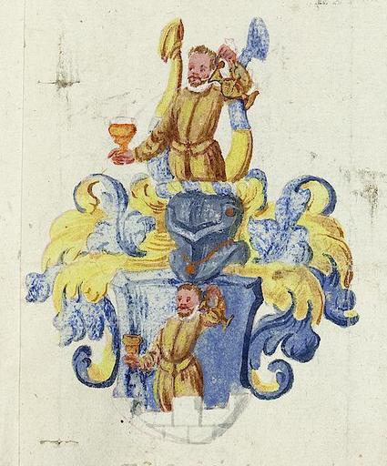 Keywords: UBHD Cod Sal IX 58 100r 2.jpg Wappen aus dem Wappenbuch des Hofpfalzgrafen Franz Rasso Gotthardt Entstanden in Süddeutschland Passau Universitätsbibliothek Heidelberg Cod Sal IX 58 <br />Wappen http //digi ub uni-heidelberg de/diglit/salIX58 after 1597 1623 “1631 Franz Rasso Gotthardt PD-old-100 Wappenbuch der Hofpfalzgrafen Coats of arms of families of Germany Terraces in base argent Walls in heraldry Men in heraldry Cups in heraldry Jugs in heraldry Men in crest Bull horns in crest Argent azure Or in heraldry |