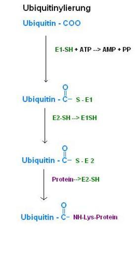 Keywords: Ubiquitinylierung.JPG A scheme showing the mechanism ubiquitation I made it myself with MS paint Adopted with slight changes from Stryer Lubert Biochemie Spektrum Akad Verlag Heidelberg Berlin Oxford 1996 2006-08-25 own assumed Nasiruddin Post-translational modifications Protein degradation |
