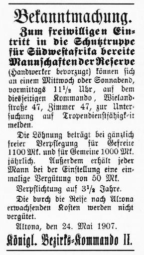 | Keywords: Uetersen Aufruf Schtztruppe Südwestafrika 1907.jpg  de Bekanntmachung zum freiwilligen Eintritt in die Schutztruppe in Südwestafrika Anzeige aus den Uetersener Nachrichten vom 27 Mai 1907 eigene reproduktion das Original mehr als 70 Jahre alt own reproduktion original is more than 70 years old Author 1907 other fields 1 inscription inscription <big>Bekanntmachung</big> Zum freiwilligen Eintritt<br />in die Schutztruppe<br />für Südwestafrika bereite<br />Mannschaften der Reserve Handwerker bevorzugt können sich<br />an einem Mittwoch oder Sonnabend <br />vormittags 11 nbps;1/2 Uhr auf dem<br />diesseitigen Kommando Wiedlandstraße 47 <br />Zimmer 47 zur Untersuchung<br />auf Tropenfähigkeit melden Die Löhnung beträgt bei gänzlich<br />freier Verpflegung für Gefreite<br />1100 Mk und für Gemeine 1000 Mk <br />jährlich Außerdem erhält jeder<br />Mann bei der Einstellung eine einmalige<br />Vergütung von 50 Mk Verpflichtung auf 3½ Jahre Die durch die Reise nach Altona<br />erwachsenden Kosten werden nicht<br />vergütet Altona den 24 Mai 1907 <big>Königl Bezirks-kommando II </big> de PD-old Herero and Namaqua Revolt Category Documents of Uetersen |