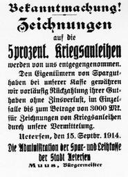 | Keywords: Uetersen Bekanntmachung Kriegsanleihe 1914.jpg  de Bekanntmachung zur Zeichnung auf die 5prozentige Kriegsanleihe in den Uetersener Nachrichten 1914 eigene reproduktion das Original mehr als 70 Jahre alt own reproduktion original is more than 70 years old Author 1914 Germany in World War I Documents of Uetersen World War I PD-old  |