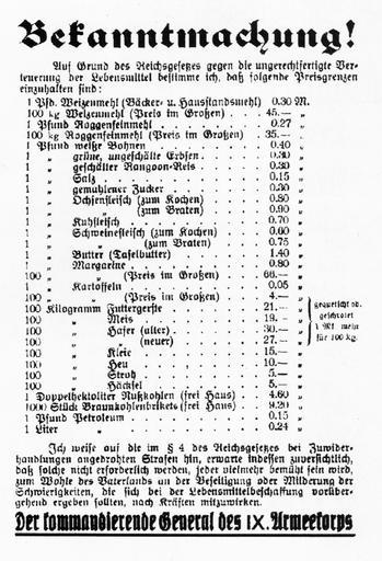 | Keywords: Uetersen Bekanntmachung Lebensmittelpreise 1914.jpg  de Bekanntmachung der Lebensmittelpreise in den Uetersener Nachrichten 1914 eigene reproduktion das Original mehr als 70 Jahre alt own reproduktion original is more than 70 years old Author 1914 Germany in World War I Documents of Uetersen World War I PD-old  |