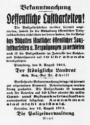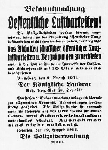 | Keywords: Uetersen Bekanntmachung Oeffentliche Lustbarkeiten Aug. 1914.jpg  de Bekanntmachung Tanzverbot in den Uetersener Nachrichten 1914 eigene reproduktion das Original mehr als 70 Jahre alt own reproduktion original is more than 70 years old Author 1914 Germany in World War I Documents of Uetersen World War I PD-old  |