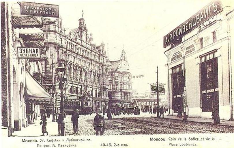 | Keywords: Ugol sofijki i lubjanskoj ploshadi.jpg Угол Софийки Пушечной ул и и Лубянской площади Angle of Sofiyka Pushechnaya Street and Lubyanka Square http //turizm lib ru/n/nowak_a_w/varvarka shtml с 1900 Author PD-RusEmpire Historical images of Lubyanka Square Pushechnaya Street PD-Old |