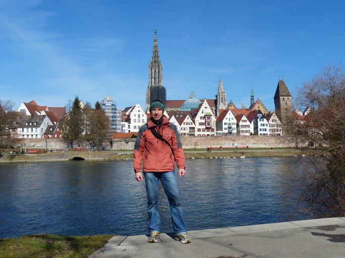 Keywords: ulm ulm cathedral city outlook city view münster view home homes sky church steeple roofs danube city panorama panorama spire city wall metzgerturm town home river water human man stand holiday photo memory