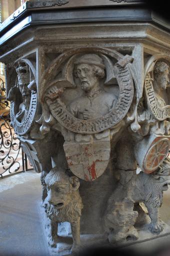 Keywords: Ulmer Münster Taufstein Detail mit Wappen Trier.jpg Ulm Ulmer Münster Taufstein 1474 Detail Figur mit dem Wappen des Kurfürsten von Trier own 2013-11-11 Uli E Baptismal font of Ulm Minster Trier See coat of arms Reliefs of coats of arms in Ulm |