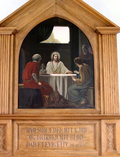 Keywords: Ulsted Kirke Indre10 gl altertavle.jpg Ulsted Kirke Aalborg Stift Altertavle kopi af Carl Bloch Kristus i Emmaus own Own photo 2006-10 Gunnar Bach Pedersen PD da Ulsted Kirke Ulsted Kirke Reredos Carl Bloch GunnarBach Supper at Emmaus