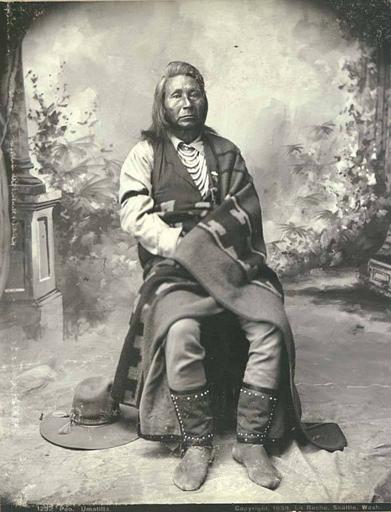 Keywords: Umatilla man known as Peo, Washington, 1899 (LAROCHE 63).jpeg Photograph Creator Frank La Roche Studio portrait of an Umatilla man called Peo He is seated wearing western-style clothing with necklaces and a blanket across one shoulder and lap He has decorated bands around his calves on the floor sits a wide-brimmed hat He is posed in front of a painted backdrop of an arbor Caption on image Peo Umatilla Studio portrait with painted backdrop Subjects LCSH Peo; Portraits--Washington State ; Umatilla Indians--Clothing dress depicted place Washington state 1899 Institution University of Washington UWASH-LAROCHE-source accession number laroche 63 PD-old-auto-1923 1936 Information field Order Number LAR307 Umatilla 19th-century portrait photographs of sitting men at full length People of Washington state 1899 in Washington state |