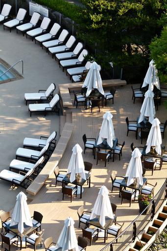 Keywords: umbrellas sunloungers arrangement pool site vacation relax parasol resort deckchair relaxation