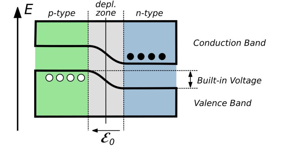 Keywords: Un-Biased pn Junction Bands.svg Diagram of a pn junction under no external bias showing conduction and valence bands the built-in voltage the built-in electric field <math>\mathcal E _0</math> and the types of semiconductor own drawing done in Inkscape 2007-02-20 inductiveload PN-junction band diagrams |