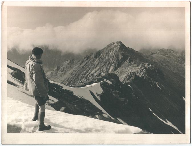 Keywords: Let me know if you know better. Taken (another guess) 1950s? From Great Uncle Reg's collection. landscape mountains snow bw blackandwhite antique 1950s man hiking