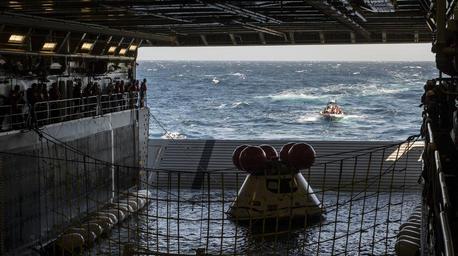 | Keywords: Underway recovery test 140917-N-GO855-078.jpg en A NASA Orion crew module is pulled into position in the well deck of the amphibious transport dock ship USS Anchorage LPD 23 during the Orion Program's fourth underway recovery test URT-4 URT-4 is the fourth at-sea recovery testing of the Orion crew module using a well deck recovery method U S Navy photo by Mass Communication Specialist 1st Class Charles White/Released 2014-09-17 Petty Officer 2nd Class Charles White https //www dvidshub net/image/1566261 140917-N-GO855-078 2014-09-24 22 44 PACIFIC OCEAN PD-USGov-Military-Navy USS Anchorage LPD-23 Images from DoD uploaded by Fæ Orion spacecraft |