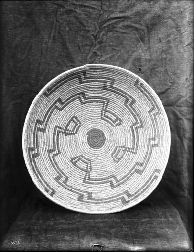 Photograph of an unidentified Indian basket on display, photographed ca.1900. It is displayed leaning against a dark cloth. The large flat platter-shaped basket has is woven spirally and has a stepped pattern in its design.
