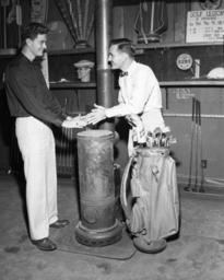 MAKE A MEME View Large Image Persistent URL: floridamemory.com/items/show/259850 Local call number: TD00046 Title: Unidentified men warming up in the Tallahassee Country Club pro shop Date: 1953 Physical descrip: 1 photonegative - b&w - 5 x 4 in. Series Title: ...