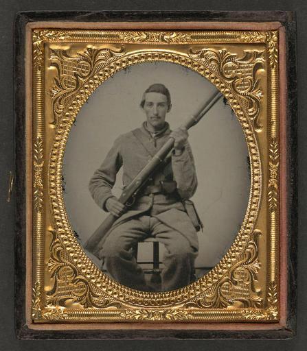 | Keywords: library of congress libraryofcongress dc:identifier=http://hdl.loc.gov/loc.pnp/ppmsca.27196 dc:identifier=httphdllocgovlocpnpppmsca27196 xmlns:dc=http://purl.org/dc/elements/1.1/ xmlns:dc=httppurlorgdcelements11 u.s. civil war uscivilwar american civil war americancivilwar the civil war thecivilwar civil war civilwar war between the states warbetweenthestates confederate states of america confederatestatesofamerica c.s.a. csa the confederacy theconfederacy confederacy confederate the south thesouth rebel rebels soldier gun musket picture frame people indoor photo border [Unidentified soldier in Confederate uniform with musket] [between 1861 and 1865] 1 photograph : sixth-plate ambrotype, hand-colored ; 9.4 x 8.1 cm (case) Notes: Title devised by Library staff. Case: Leather diamond geometric design. Additional information in collections file. Deposit; Tom Liljenquist; 2010; (D 062). Purchased from: The Historical Shop, Metairie, Louisiana, 2010. Published in: Turner, William A. Even more Confederate faces. Gaithersburg, Md.: Olde Soldier Books, Inc.,1983, p. 201. Subjects: Confederate States of America.--Army--People--1860-1870. Soldiers--Confederate--1860-1870. Military uniforms--Confederate--1860-1870. Rifles--1860-1870. United States--History--Civil War, 1861-1865--Military personnel--Confederate. Format: Portrait photographs--1860-1870. Ambrotypes--Hand-colored--1860-1870. Rights Info: No known restrictions on publication. Repository: Library of Congress, Prints and Photographs Division, Washington, D.C. 20540 USA, hdl.loc.gov/loc.pnp/pp.print Part Of: Ambrotype/Tintype filing series (Library of Congress) (DLC) 2010650518 Liljenquist Family collection (Library of Congress) (DLC) 2010650519 More information about this collection is available at hdl.loc.gov/loc.pnp/pp.lilj Persistent URL: hdl.loc.gov/loc.pnp/ppmsca.27196 Call Number: AMB/TIN no. 2343 [Unidentified soldier in Confederate uniform with musket] [between 1861 and 1865] 1 photograph : sixth-plate ambrotype, hand-colored ; 9.4 x 8.1 cm (case) Notes: Title devised by Library staff. Case: Leather diamond geometric design. Additional information in collections file. Deposit; Tom Liljenquist; 2010; (D 062). Purchased from: The Historical Shop, Metairie, Louisiana, 2010. Published in: Turner, William A. Even more Confederate faces. Gaithersburg, Md.: Olde Soldier Books, Inc.,1983, p. 201. Subjects: Confederate States of America.--Army--People--1860-1870. Soldiers--Confederate--1860-1870. Military uniforms--Confederate--1860-1870. Rifles--1860-1870. United States--History--Civil War, 1861-1865--Military personnel--Confederate. Format: Portrait photographs--1860-1870. Ambrotypes--Hand-colored--1860-1870. Rights Info: No known restrictions on publication. Repository: Library of Congress, Prints and Photographs Division, Washington, D.C. 20540 USA, hdl.loc.gov/loc.pnp/pp.print Part Of: Ambrotype/Tintype filing series (Library of Congress) (DLC) 2010650518 Liljenquist Family collection (Library of Congress) (DLC) 2010650519 More information about this collection is available at hdl.loc.gov/loc.pnp/pp.lilj Persistent URL: hdl.loc.gov/loc.pnp/ppmsca.27196 Call Number: AMB/TIN no. 2343 |