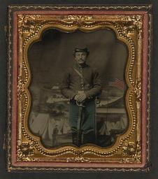 | Keywords: library of congress libraryofcongress dc:identifier=http://hdl.loc.gov/loc.pnp/ppmsca.27044 dc:identifier=httphdllocgovlocpnpppmsca27044 xmlns:dc=http://purl.org/dc/elements/1.1/ xmlns:dc=httppurlorgdcelements11 people picture frame photo border [Unidentified soldier in Union uniform with sword in front of painted backdrop showing military camp scene] [between 1861 and 1865] 1 photograph : sixth-plate tintype, hand-colored ; 9.3 x 8.2 cm (case) Notes: Title devised by Library staff. Case: Leather geometric gem and scroll design. Gift; Tom Liljenquist; 2010; (DLC/PP-2010:105). Subjects: Soldiers--Union--1860-1870. Military uniforms--Union--1860-1870. Daggers & swords--1860-1870. Backdrops--1860-1870. United States--History--Civil War, 1861-1865--Military personnel--Union. Format: Portrait photographs--1860-1870. Tintypes--Hand-colored--1860-1870. Rights Info: No known restrictions on publication. Repository: Library of Congress, Prints and Photographs Division, Washington, D.C. 20540 USA, hdl.loc.gov/loc.pnp/pp.print Part Of: Ambrotype/Tintype filing series (Library of Congress) (DLC) 2010650518 Liljenquist Family collection (Library of Congress) (DLC) 2010650519 More information about this collection is available at hdl.loc.gov/loc.pnp/pp.lilj Persistent URL: hdl.loc.gov/loc.pnp/ppmsca.27044 Call Number: AMB/TIN no. 2190 [Unidentified soldier in Union uniform with sword in front of painted backdrop showing military camp scene] [between 1861 and 1865] 1 photograph : sixth-plate tintype, hand-colored ; 9.3 x 8.2 cm (case) Notes: Title devised by Library staff. Case: Leather geometric gem and scroll design. Gift; Tom Liljenquist; 2010; (DLC/PP-2010:105). Subjects: Soldiers--Union--1860-1870. Military uniforms--Union--1860-1870. Daggers & swords--1860-1870. Backdrops--1860-1870. United States--History--Civil War, 1861-1865--Military personnel--Union. Format: Portrait photographs--1860-1870. Tintypes--Hand-colored--1860-1870. Rights Info: No known restrictions on publication. Repository: Library of Congress, Prints and Photographs Division, Washington, D.C. 20540 USA, hdl.loc.gov/loc.pnp/pp.print Part Of: Ambrotype/Tintype filing series (Library of Congress) (DLC) 2010650518 Liljenquist Family collection (Library of Congress) (DLC) 2010650519 More information about this collection is available at hdl.loc.gov/loc.pnp/pp.lilj Persistent URL: hdl.loc.gov/loc.pnp/ppmsca.27044 Call Number: AMB/TIN no. 2190 |
