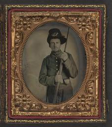 | Keywords: library of congress libraryofcongress dc:identifier=http://hdl.loc.gov/loc.pnp/ppmsca.27015 dc:identifier=httphdllocgovlocpnpppmsca27015 xmlns:dc=http://purl.org/dc/elements/1.1/ xmlns:dc=httppurlorgdcelements11 people picture frame photo border [Unidentified soldier in Union uniform and plumed infantry Hardee hat with bayoneted musket and cap box] [between 1861 and 1865] 1 photograph : sixth-plate ambrotype, hand-colored ; 9.5 x 8.2 cm (case) Notes: Title devised by Library staff. Case: Leather floral motif. Gift; Tom Liljenquist; 2010; (DLC/PP-2010:105). Subjects: United States.--Army.--People--1860-1870. Soldiers--Union--1860-1870. Military uniforms--Union--1860-1870. Rifles--1860-1870. Bayonets--1860-1870. United States--History--Civil War, 1861-1865--Military personnel--Union. Format: Portrait photographs--1860-1870. Ambrotypes--Hand-colored--1860-1870. Rights Info: No known restrictions on publication. Repository: Library of Congress, Prints and Photographs Division, Washington, D.C. 20540 USA, hdl.loc.gov/loc.pnp/pp.print Part Of: Ambrotype/Tintype filing series (Library of Congress) (DLC) 2010650518 Liljenquist Family collection (Library of Congress) (DLC) 2010650519 More information about this collection is available at hdl.loc.gov/loc.pnp/pp.lilj Persistent URL: hdl.loc.gov/loc.pnp/ppmsca.27015 Call Number: AMB/TIN no. 2160 [Unidentified soldier in Union uniform and plumed infantry Hardee hat with bayoneted musket and cap box] [between 1861 and 1865] 1 photograph : sixth-plate ambrotype, hand-colored ; 9.5 x 8.2 cm (case) Notes: Title devised by Library staff. Case: Leather floral motif. Gift; Tom Liljenquist; 2010; (DLC/PP-2010:105). Subjects: United States.--Army.--People--1860-1870. Soldiers--Union--1860-1870. Military uniforms--Union--1860-1870. Rifles--1860-1870. Bayonets--1860-1870. United States--History--Civil War, 1861-1865--Military personnel--Union. Format: Portrait photographs--1860-1870. Ambrotypes--Hand-colored--1860-1870. Rights Info: No known restrictions on publication. Repository: Library of Congress, Prints and Photographs Division, Washington, D.C. 20540 USA, hdl.loc.gov/loc.pnp/pp.print Part Of: Ambrotype/Tintype filing series (Library of Congress) (DLC) 2010650518 Liljenquist Family collection (Library of Congress) (DLC) 2010650519 More information about this collection is available at hdl.loc.gov/loc.pnp/pp.lilj Persistent URL: hdl.loc.gov/loc.pnp/ppmsca.27015 Call Number: AMB/TIN no. 2160 |
