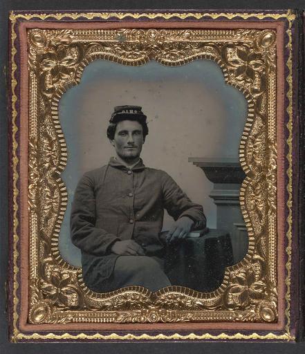 Keywords: library of congress libraryofcongress dc:identifier=http://hdl.loc.gov/loc.pnp/ppmsca.26906 dc:identifier=httphdllocgovlocpnpppmsca26906 xmlns:dc=http://purl.org/dc/elements/1.1/ xmlns:dc=httppurlorgdcelements11 civil war civilwar us civil war uscivilwar united states unitedstates soldier american american civil war americancivilwar uniform military soldiersnpm frame picture frame people photo border [Unidentified soldier in Union uniform next to table and pedestal] [between 1861 and 1865] 1 photograph : sixth-plate ambrotype, hand-colored ; 9.3 x 8.1 cm (case) Notes: Title devised by Library staff. Case: Leather geometric scroll motif. Photograph shows "Ohio" fashioned on kepi with makeshift combination of letter and number badges. Gift; Tom Liljenquist; 2010; (DLC/PP-2010:105). Subjects: United States.--Army--People--1860-1870. Soldiers--Union--1860-1870. Military uniforms--Union--1860-1870. United States--History--Civil War, 1861-1865--Military personnel--Union. Format: Group portraits--1860-1870. Portrait photographs--1860-1870. Ambrotypes--Hand-colored--1860-1870. Rights Info: No known restrictions on publication. Repository: Library of Congress, Prints and Photographs Division, Washington, D.C. 20540 USA, hdl.loc.gov/loc.pnp/pp.print Part Of: Ambrotype/Tintype filing series (Library of Congress) (DLC) 2010650518 Liljenquist Family collection (Library of Congress) (DLC) 2010650519 More information about this collection is available at hdl.loc.gov/loc.pnp/pp.lilj Persistent URL: hdl.loc.gov/loc.pnp/ppmsca.26906 Call Number: AMB/TIN no. 2053 [Unidentified soldier in Union uniform next to table and pedestal] [between 1861 and 1865] 1 photograph : sixth-plate ambrotype, hand-colored ; 9.3 x 8.1 cm (case) Notes: Title devised by Library staff. Case: Leather geometric scroll motif. Photograph shows "Ohio" fashioned on kepi with makeshift combination of letter and number badges. Gift; Tom Liljenquist; 2010; (DLC/PP-2010:105). Subjects: United States.--Army--People--1860-1870. Soldiers--Union--1860-1870. Military uniforms--Union--1860-1870. United States--History--Civil War, 1861-1865--Military personnel--Union. Format: Group portraits--1860-1870. Portrait photographs--1860-1870. Ambrotypes--Hand-colored--1860-1870. Rights Info: No known restrictions on publication. Repository: Library of Congress, Prints and Photographs Division, Washington, D.C. 20540 USA, hdl.loc.gov/loc.pnp/pp.print Part Of: Ambrotype/Tintype filing series (Library of Congress) (DLC) 2010650518 Liljenquist Family collection (Library of Congress) (DLC) 2010650519 More information about this collection is available at hdl.loc.gov/loc.pnp/pp.lilj Persistent URL: hdl.loc.gov/loc.pnp/ppmsca.26906 Call Number: AMB/TIN no. 2053 |
