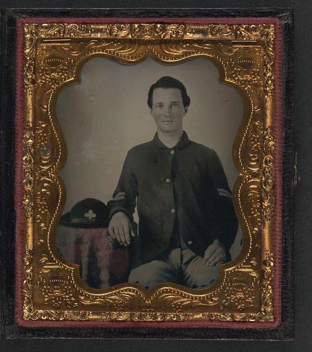 Keywords: library of congress libraryofcongress dc:identifier=http://hdl.loc.gov/loc.pnp/ppmsca.27094 dc:identifier=httphdllocgovlocpnpppmsca27094 xmlns:dc=http://purl.org/dc/elements/1.1/ xmlns:dc=httppurlorgdcelements11 tablecloth people picture frame photo border [Unidentified soldier in Union corporal's uniform resting arm on table with 2nd Corps, Army of the Potomac slouch cap on top] [between 1862 and 1865] 1 photograph : sixth-plate ambrotype, hand-colored ; 9.4 x 8.3 cm (case) Notes: Title devised by Library staff. Case: Rinhart, no. 80. Photograph shows 2nd Corps insignia on slouch cap. Gift; Tom Liljenquist; 2010; (DLC/PP-2010:105). Subjects: United States.--Army of the Potomac--Corps, 2nd--People--1860-1870. Soldiers--Union--1860-1870. Military uniforms--Union--1860-1870. United States--History--Civil War, 1861-1865--Military personnel--Union. Format: Portrait photographs--1860-1870. Ambrotypes--Hand-colored--1860-1870. Rights Info: No known restrictions on publication. Repository: Library of Congress, Prints and Photographs Division, Washington, D.C. 20540 USA, hdl.loc.gov/loc.pnp/pp.print Part Of: Ambrotype/Tintype filing series (Library of Congress) (DLC) 2010650518 Liljenquist Family collection (Library of Congress) (DLC) 2010650519 More information about this collection is available at hdl.loc.gov/loc.pnp/pp.lilj Persistent URL: hdl.loc.gov/loc.pnp/ppmsca.27094 Call Number: AMB/TIN no. 2241 [Unidentified soldier in Union corporal's uniform resting arm on table with 2nd Corps, Army of the Potomac slouch cap on top] [between 1862 and 1865] 1 photograph : sixth-plate ambrotype, hand-colored ; 9.4 x 8.3 cm (case) Notes: Title devised by Library staff. Case: Rinhart, no. 80. Photograph shows 2nd Corps insignia on slouch cap. Gift; Tom Liljenquist; 2010; (DLC/PP-2010:105). Subjects: United States.--Army of the Potomac--Corps, 2nd--People--1860-1870. Soldiers--Union--1860-1870. Military uniforms--Union--1860-1870. United States--History--Civil War, 1861-1865--Military personnel--Union. Format: Portrait photographs--1860-1870. Ambrotypes--Hand-colored--1860-1870. Rights Info: No known restrictions on publication. Repository: Library of Congress, Prints and Photographs Division, Washington, D.C. 20540 USA, hdl.loc.gov/loc.pnp/pp.print Part Of: Ambrotype/Tintype filing series (Library of Congress) (DLC) 2010650518 Liljenquist Family collection (Library of Congress) (DLC) 2010650519 More information about this collection is available at hdl.loc.gov/loc.pnp/pp.lilj Persistent URL: hdl.loc.gov/loc.pnp/ppmsca.27094 Call Number: AMB/TIN no. 2241 |