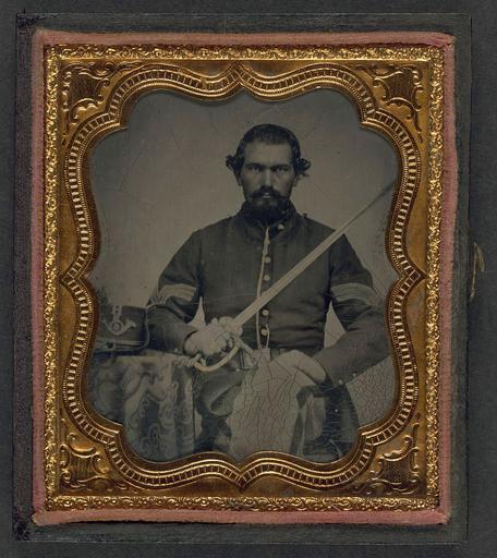 Keywords: library of congress libraryofcongress dc:identifier=http://hdl.loc.gov/loc.pnp/ppmsca.26912 dc:identifier=httphdllocgovlocpnpppmsca26912 xmlns:dc=http://purl.org/dc/elements/1.1/ xmlns:dc=httppurlorgdcelements11 picture frame people photo border [Unidentified soldier in Union infantry sergeant's uniform holding a model 1840 non-comissioned officer's sword next to table with Company H, 6th Regiment Hardee hat on top] [between 1861 and 1865] 1 photograph : sixth-plate tintype, hand-colored ; 9.4 x 8.1 cm (case) Notes: Title devised by Library staff. Case: Leather geometric. Gift; Tom Liljenquist; 2010; (DLC/PP-2010:105). Subjects: United States.--Army--People--1860-1870. Soldiers--Union--1860-1870. Military uniforms--Union--1860-1870. Daggers & swords--Union--1860-1870. United States--History--Civil War, 1861-1865--Military personnel--Union. Format: Portrait photographs--1860-1870. Tintypes--Hand-colored--1860-1870. Rights Info: No known restrictions on publication. Repository: Library of Congress, Prints and Photographs Division, Washington, D.C. 20540 USA, hdl.loc.gov/loc.pnp/pp.print Part Of: Ambrotype/Tintype filing series (Library of Congress) (DLC) 2010650518 Liljenquist Family collection (Library of Congress) (DLC) 2010650519 More information about this collection is available at hdl.loc.gov/loc.pnp/pp.lilj Persistent URL: hdl.loc.gov/loc.pnp/ppmsca.26912 Call Number: AMB/TIN no. 2059 [Unidentified soldier in Union infantry sergeant's uniform holding a model 1840 non-comissioned officer's sword next to table with Company H, 6th Regiment Hardee hat on top] [between 1861 and 1865] 1 photograph : sixth-plate tintype, hand-colored ; 9.4 x 8.1 cm (case) Notes: Title devised by Library staff. Case: Leather geometric. Gift; Tom Liljenquist; 2010; (DLC/PP-2010:105). Subjects: United States.--Army--People--1860-1870. Soldiers--Union--1860-1870. Military uniforms--Union--1860-1870. Daggers & swords--Union--1860-1870. United States--History--Civil War, 1861-1865--Military personnel--Union. Format: Portrait photographs--1860-1870. Tintypes--Hand-colored--1860-1870. Rights Info: No known restrictions on publication. Repository: Library of Congress, Prints and Photographs Division, Washington, D.C. 20540 USA, hdl.loc.gov/loc.pnp/pp.print Part Of: Ambrotype/Tintype filing series (Library of Congress) (DLC) 2010650518 Liljenquist Family collection (Library of Congress) (DLC) 2010650519 More information about this collection is available at hdl.loc.gov/loc.pnp/pp.lilj Persistent URL: hdl.loc.gov/loc.pnp/ppmsca.26912 Call Number: AMB/TIN no. 2059 |