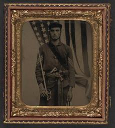 Keywords: library of congress libraryofcongress dc:identifier=http://hdl.loc.gov/loc.pnp/ppmsca.27129 dc:identifier=httphdllocgovlocpnpppmsca27129 xmlns:dc=http://purl.org/dc/elements/1.1/ xmlns:dc=httppurlorgdcelements11 u.s. civil war uscivilwar american civil war americancivilwar the civil war thecivilwar civil war civilwar war between the states warbetweenthestates united states of america unitedstatesofamerica u.s.a. usa the union theunion union the north thenorth yankee yankees soldier sergeant non-commissioned officer noncommissionedofficer nco sash sword gun pistol revolver picture frame people photo border [Unidentified soldier in Union sergeant uniform and sash with Model 1840 non-commissioned officer's sword, revolver, cap box, and knife in front of American flag] [between 1861 and 1865] 1 photograph : sixth-plate tintype, hand-colored ; 9.2 x 8.1 cm (case) Notes: Title devised by Library staff. Case: (front) Berg, no. 4-17G; (back) leather scroll floral design. Gift; Tom Liljenquist; 2010; (DLC/PP-2010:105). Subjects: United States.--Army--People--1860-1870. Soldiers--Union--1860-1870. Military uniforms--Union--1860-1870. Daggers & swords--1860-1870. Handguns--1860-1870. Knives--1860-1870. Backdrops--1860-1870. United States--History--Civil War, 1861-1865--Military personnel--Union. Format: Portrait photographs--1860-1870. Tintypes--Hand-colored--1860-1870. Rights Info: No known restrictions on publication. Repository: Library of Congress, Prints and Photographs Division, Washington, D.C. 20540 USA, hdl.loc.gov/loc.pnp/pp.print Part Of: Ambrotype/Tintype filing series (Library of Congress) (DLC) 2010650518 Liljenquist Family collection (Library of Congress) (DLC) 2010650519 More information about this collection is available at hdl.loc.gov/loc.pnp/pp.lilj Persistent URL: hdl.loc.gov/loc.pnp/ppmsca.27129 Call Number: AMB/TIN no. 2276 [Unidentified soldier in Union sergeant uniform and sash with Model 1840 non-commissioned officer's sword, revolver, cap box, and knife in front of American flag] [between 1861 and 1865] 1 photograph : sixth-plate tintype, hand-colored ; 9.2 x 8.1 cm (case) Notes: Title devised by Library staff. Case: (front) Berg, no. 4-17G; (back) leather scroll floral design. Gift; Tom Liljenquist; 2010; (DLC/PP-2010:105). Subjects: United States.--Army--People--1860-1870. Soldiers--Union--1860-1870. Military uniforms--Union--1860-1870. Daggers & swords--1860-1870. Handguns--1860-1870. Knives--1860-1870. Backdrops--1860-1870. United States--History--Civil War, 1861-1865--Military personnel--Union. Format: Portrait photographs--1860-1870. Tintypes--Hand-colored--1860-1870. Rights Info: No known restrictions on publication. Repository: Library of Congress, Prints and Photographs Division, Washington, D.C. 20540 USA, hdl.loc.gov/loc.pnp/pp.print Part Of: Ambrotype/Tintype filing series (Library of Congress) (DLC) 2010650518 Liljenquist Family collection (Library of Congress) (DLC) 2010650519 More information about this collection is available at hdl.loc.gov/loc.pnp/pp.lilj Persistent URL: hdl.loc.gov/loc.pnp/ppmsca.27129 Call Number: AMB/TIN no. 2276 |