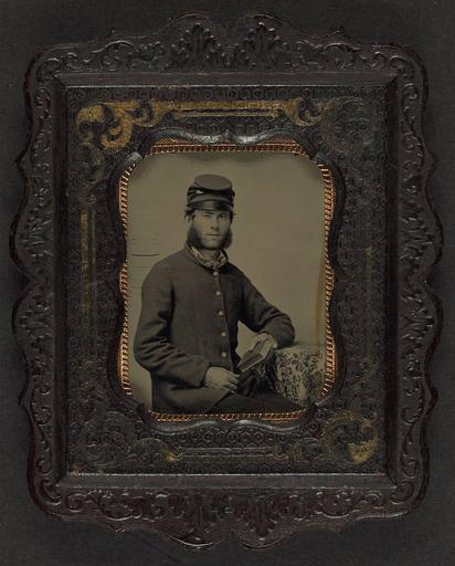 | Keywords: library of congress libraryofcongress dc:identifier=http://hdl.loc.gov/loc.pnp/ppmsca.27443 dc:identifier=httphdllocgovlocpnpppmsca27443 xmlns:dc=http://purl.org/dc/elements/1.1/ xmlns:dc=httppurlorgdcelements11 u.s. civil war uscivilwar american civil war americancivilwar the civil war thecivilwar civil war civilwar war between the states warbetweenthestates united states of america unitedstatesofamerica u.s.a. usa the union theunion union the north thenorth yankee yankees soldier people picture frame photo border [Unidentified soldier in Union frock coat and forage cap holding book] [between 1861 and 1865] 1 photograph : ninth-plate ambrotype, hand-colored ; 10.1 x 8.0 cm (frame) Notes: Title devised by Library staff. Case: Berg, no. 7-53. Gift; Tom Liljenquist; 2010; (DLC/PP-2010:105). Subjects: United States.--Army.--People--1860-1870. United States.--Army.--People--1860-1870. Soldiers--Union--1860-1870. Military uniforms--Union--1860-1870. Books--1860-1870. United States--History--Civil War, 1861-1865--Military personnel--Union. Format: Portrait photographs--1860-1870. Ambrotypes--Hand-colored--1860-1870. Rights Info: No known restrictions on publication. Repository: Library of Congress, Prints and Photographs Division, Washington, D.C. 20540 USA, hdl.loc.gov/loc.pnp/pp.print Part Of: Ambrotype/Tintype filing series (Library of Congress) (DLC) 2010650518 Liljenquist Family collection (Library of Congress) (DLC) 2010650519 More information about this collection is available at hdl.loc.gov/loc.pnp/pp.lilj Persistent URL: hdl.loc.gov/loc.pnp/ppmsca.27443 Call Number: AMB/TIN no. 2572 [Unidentified soldier in Union frock coat and forage cap holding book] [between 1861 and 1865] 1 photograph : ninth-plate ambrotype, hand-colored ; 10.1 x 8.0 cm (frame) Notes: Title devised by Library staff. Case: Berg, no. 7-53. Gift; Tom Liljenquist; 2010; (DLC/PP-2010:105). Subjects: United States.--Army.--People--1860-1870. United States.--Army.--People--1860-1870. Soldiers--Union--1860-1870. Military uniforms--Union--1860-1870. Books--1860-1870. United States--History--Civil War, 1861-1865--Military personnel--Union. Format: Portrait photographs--1860-1870. Ambrotypes--Hand-colored--1860-1870. Rights Info: No known restrictions on publication. Repository: Library of Congress, Prints and Photographs Division, Washington, D.C. 20540 USA, hdl.loc.gov/loc.pnp/pp.print Part Of: Ambrotype/Tintype filing series (Library of Congress) (DLC) 2010650518 Liljenquist Family collection (Library of Congress) (DLC) 2010650519 More information about this collection is available at hdl.loc.gov/loc.pnp/pp.lilj Persistent URL: hdl.loc.gov/loc.pnp/ppmsca.27443 Call Number: AMB/TIN no. 2572 |