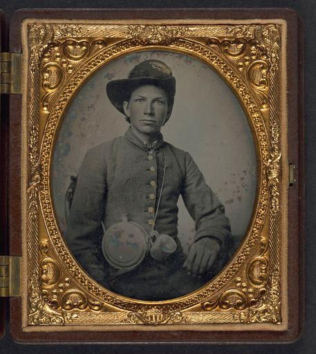 | Keywords: library of congress libraryofcongress dc:identifier=http://hdl.loc.gov/loc.pnp/ppmsca.27165 dc:identifier=httphdllocgovlocpnpppmsca27165 xmlns:dc=http://purl.org/dc/elements/1.1/ xmlns:dc=httppurlorgdcelements11 confederate hardee hat u.s. civil war uscivilwar american civil war americancivilwar the civil war thecivilwar civil war civilwar war between the states warbetweenthestates confederate states of america confederatestatesofamerica c.s.a. csa the confederacy theconfederacy confederacy the south thesouth rebels soldier confederate states army confederatestatesarmy tintype people picture frame round photo border ancient [Unidentified young soldier in Confederate shell jacket, Hardee hat with Mounted Rifles insignia and plume with canteen and cup] [between 1861 and 1865] 1 photograph : sixth-plate ambrotype, hand-colored ; 9.1 x 8.5 cm (case) Notes: Title devised by Library staff. Case: Berg, no. 3-576. Gift; Tom Liljenquist; 2010; (DLC/PP-2010:105). Published: O'Donnell, Mike, U. S. Army and militia canteens, 1775-1910. Alexandria, Va.: O'Donnell Publications, 2008, p. 75. Subjects: Confederate States of America.--Army--People--1860-1870. Soldiers--Confederate--1860-1870. Military uniforms--Confederate--1860-1870. Canteens--1860-1870. United States--History--Civil War, 1861-1865--Military personnel--Confederate. Format: Portrait photographs--1860-1870. Ambrotypes--Hand-colored--1860-1870. Rights Info: No known restrictions on publication. Repository: Library of Congress, Prints and Photographs Division, Washington, D.C. 20540 USA, hdl.loc.gov/loc.pnp/pp.print Part Of: Ambrotype/Tintype filing series (Library of Congress) (DLC) 2010650518 Liljenquist Family collection (Library of Congress) (DLC) 2010650519 More information about this collection is available at hdl.loc.gov/loc.pnp/pp.lilj Persistent URL: hdl.loc.gov/loc.pnp/ppmsca.27165 Call Number: AMB/TIN no. 2312 [Unidentified young soldier in Confederate shell jacket, Hardee hat with Mounted Rifles insignia and plume with canteen and cup] [between 1861 and 1865] 1 photograph : sixth-plate ambrotype, hand-colored ; 9.1 x 8.5 cm (case) Notes: Title devised by Library staff. Case: Berg, no. 3-576. Gift; Tom Liljenquist; 2010; (DLC/PP-2010:105). Published: O'Donnell, Mike, U. S. Army and militia canteens, 1775-1910. Alexandria, Va.: O'Donnell Publications, 2008, p. 75. Subjects: Confederate States of America.--Army--People--1860-1870. Soldiers--Confederate--1860-1870. Military uniforms--Confederate--1860-1870. Canteens--1860-1870. United States--History--Civil War, 1861-1865--Military personnel--Confederate. Format: Portrait photographs--1860-1870. Ambrotypes--Hand-colored--1860-1870. Rights Info: No known restrictions on publication. Repository: Library of Congress, Prints and Photographs Division, Washington, D.C. 20540 USA, hdl.loc.gov/loc.pnp/pp.print Part Of: Ambrotype/Tintype filing series (Library of Congress) (DLC) 2010650518 Liljenquist Family collection (Library of Congress) (DLC) 2010650519 More information about this collection is available at hdl.loc.gov/loc.pnp/pp.lilj Persistent URL: hdl.loc.gov/loc.pnp/ppmsca.27165 Call Number: AMB/TIN no. 2312 |